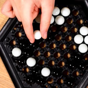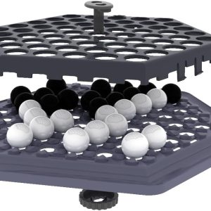 Dos bandos se enfrentan en un tablero hexagonal con Bolas blancas y negras. Para ganar, empuja 6 Bolas del oponente hacia el canal que hay en el borde del tablero.