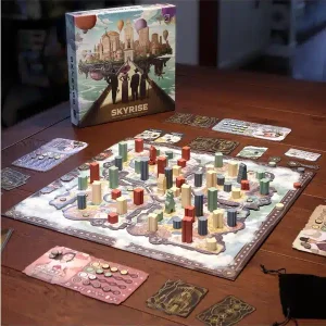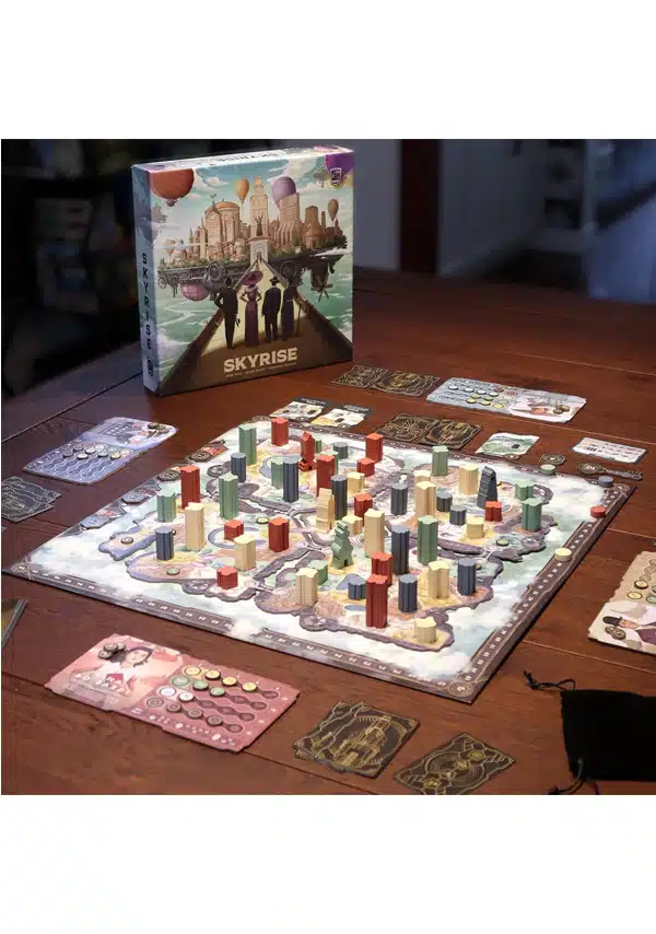 Diseñado por Adam Wyse, Gavan Brown y Sébastien Pauchon e ilustrado por Andrew Bosley, Skyrise ofrece partidas para parejas o grupos de hasta 4 personas, a partir de 14 años, de entre 30 y 75 minutos de duración. A través de mecánicas de mayorías, subastas y pujas o set collection, Skyrise nos reta a conseguir la mayor cantidad posible de puntos de prestigio.
