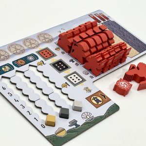El tablero central muestra el castillo de Himeji en todo su esplendor, dividido en varias zonas. La más grande es el interior del castillo, con la habitación de las mil alfombras, donde los cortesanos deberán ir ascendiendo socialmente hasta llegar al círculo más cercano al Daimio para gozar de su favor. También hay el estanque y los jardines, cuidados pacientemente por los jardineros donde todo el mundo puede relajarse y contemplar su belleza sin restricciones. Otra zona importante es la muralla y el exterior del castillo, donde los guerreros patrullan y montan guardia. Finalmente, encontramos la zona de los tres puentes, donde se acumulan los tres tipos de dados que podrán usarse para llevar a cabo acciones, y el dominio personal de cada jugador, donde llevarán las cuentas de sus recursos y donde tendrán la reserva de trabajadores.
